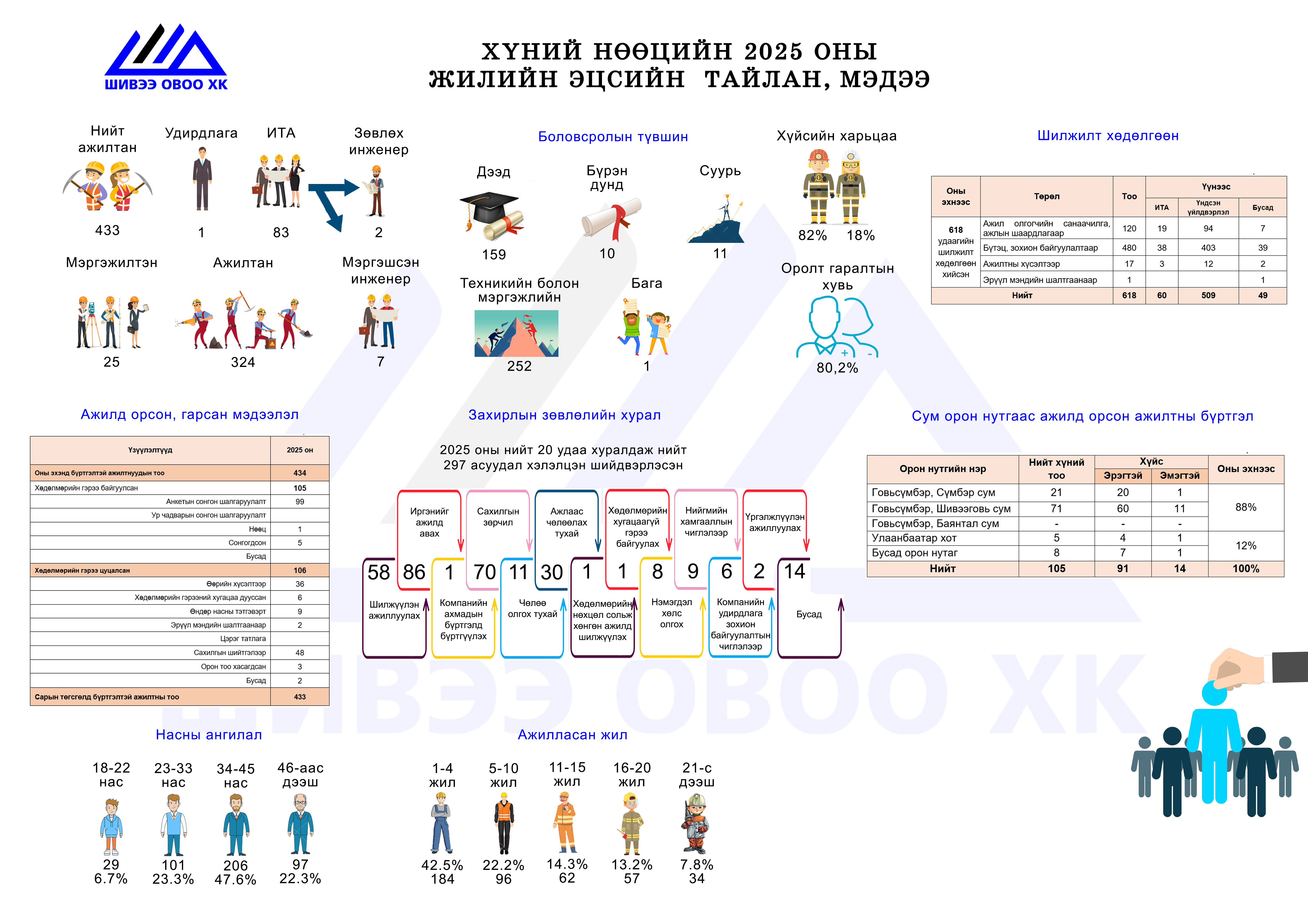 “Шивээ Овоо” ХК нь 2023 онд ажиллах хүчний төлөвлөлтөөр 487 орон тоог баталж, гүйцэтгэлээр 431 ажилтантайгаар үйл ажиллагаагаа гүйцэтгэсэн байна. Үүнээс: