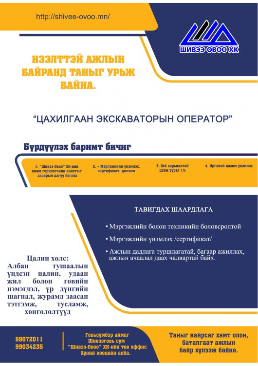 ЦАХИЛГААН ЭКСКАВАТОРЫН ОПЕРАТОР НЭЭЛТТЭЙ АЖЛЫН БАЙРАНД ТАНЫГ УРЬЖ БАЙНА.