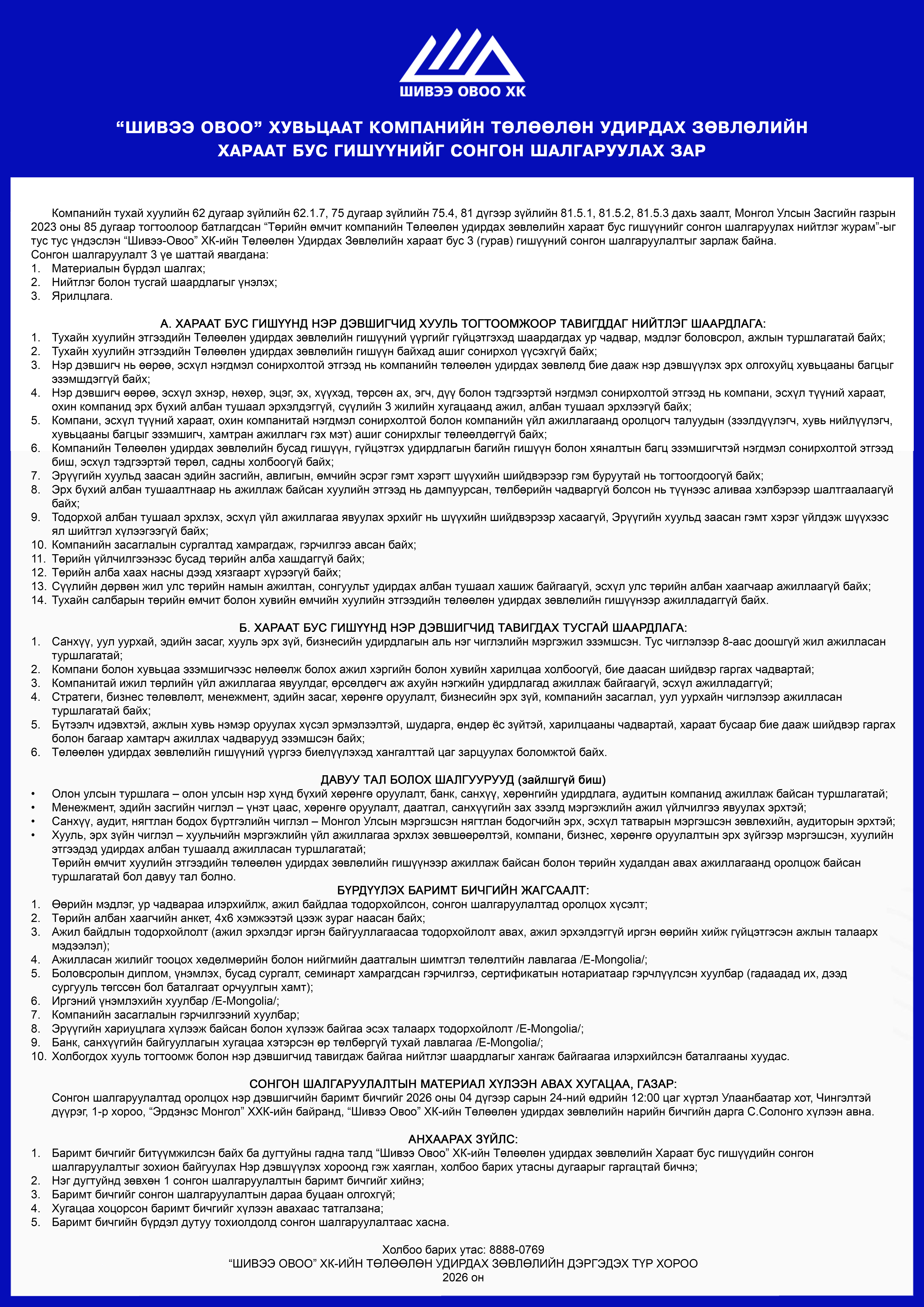 Сонгон шалгаруулалтад оролцох нэр дэвшигчийн баримт бичгийг 2026 оны 04 дүгээр сарын 24-ний өдрийн 12:00 цаг хүртэл Улаанбаатар хот, Чингэлтэй дүүрэг, 1-р хороо, “Эрдэнэс Монгол” ХХК-ийн байранд, “Шивээ Овоо” ХК-ийн Төлөөлөн удирдах зөвлөлийн нарийн бичгийн дарга С.Солонго хүлээн авна.